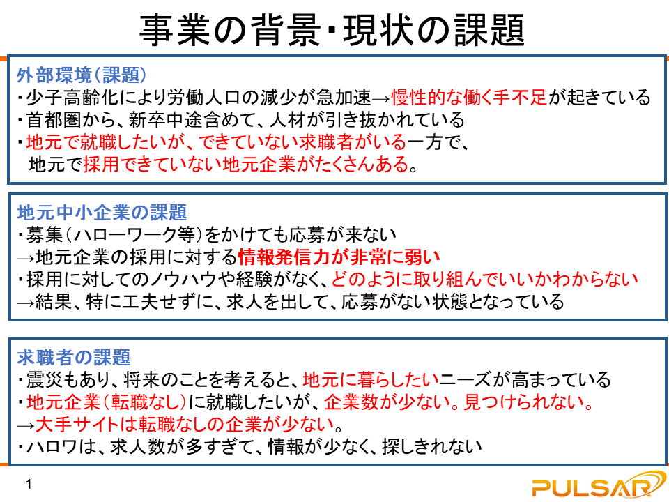 | 簗瀬: | 「少子高齢化が進む中、地域企業が新しく人を採用できないと、仙台・宮城は徐々にさびれていってしまいます。学生さんから、『いい企業があれば宮城で働きたいけれども、地域企業のことがよく分からない』とよく聞きます。一方で、地域企業さんも、『どうやれば自社に合う学生さんと会えるのか?』と仰っている。お互いにすれ違っていて、もったいないと感じることが多いです。また、採用コストも上がるばかりです。 |